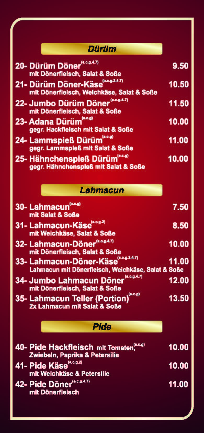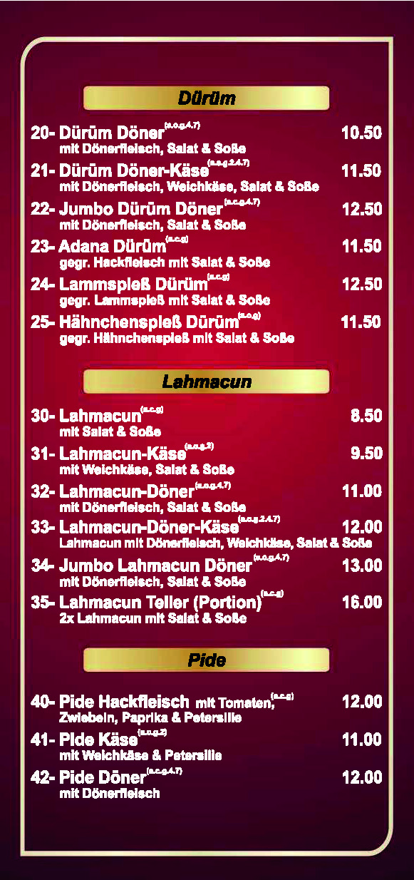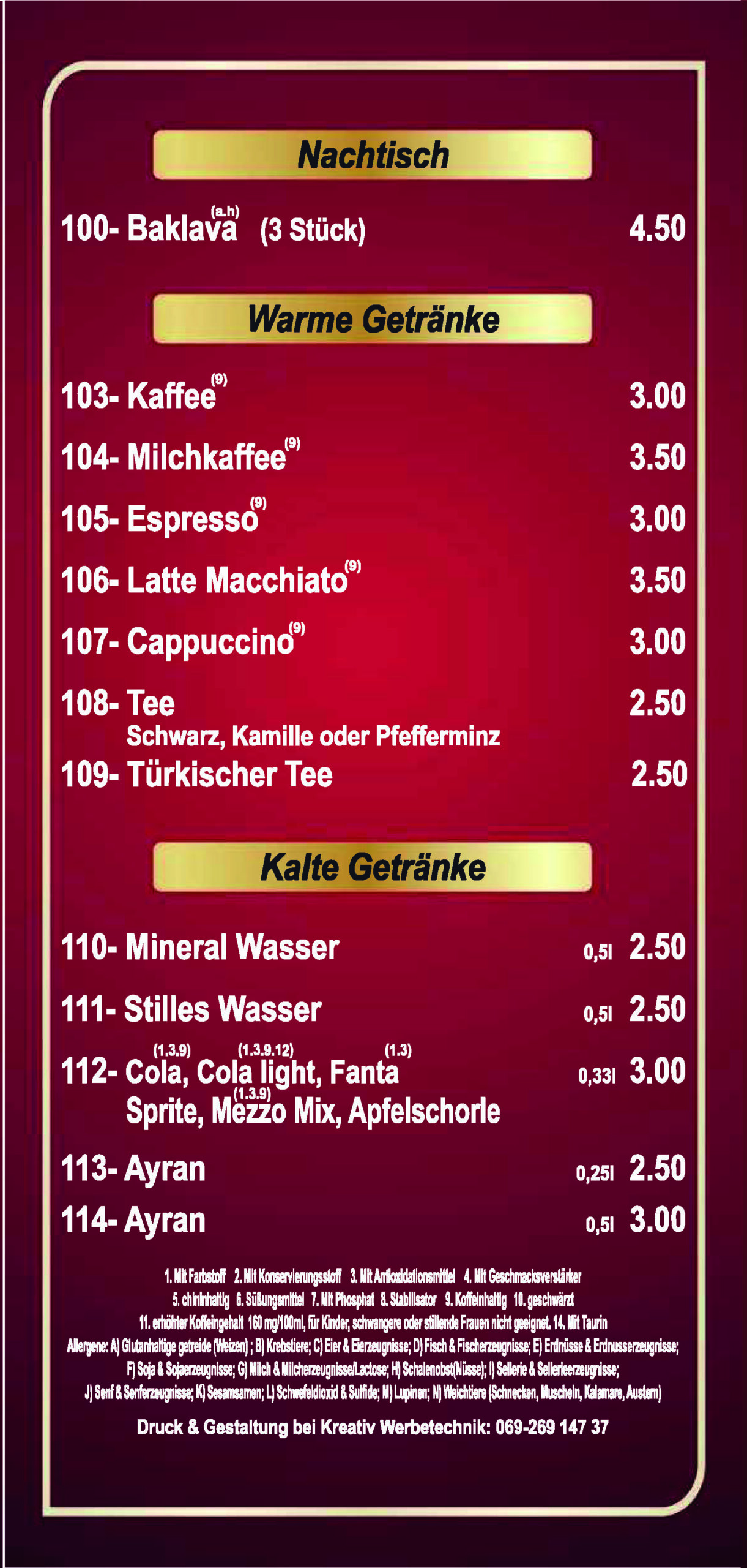 a) Glutanhaltig; b) Krebstiere; c) Eier & Eierzeugnisse; d) Fisch & Fischerzeugnisse; e) Erdnüsse & Erdnusserzeugnisse; f) Soja & Sojaerzeugnisse; g) Milch & Milcherzeugnisse/Lactose; h) Schalenobst(Nüsse); i) Sellerie & Sellerieerzeugnisse; j) Senf & Senferzeugnisse; k) Sesamsamen; l) Schwefeldioxid & Sulfide; m) Lupinen; n) Weichtiere (Schnecken, Muscheln, Kalmare, Austern)