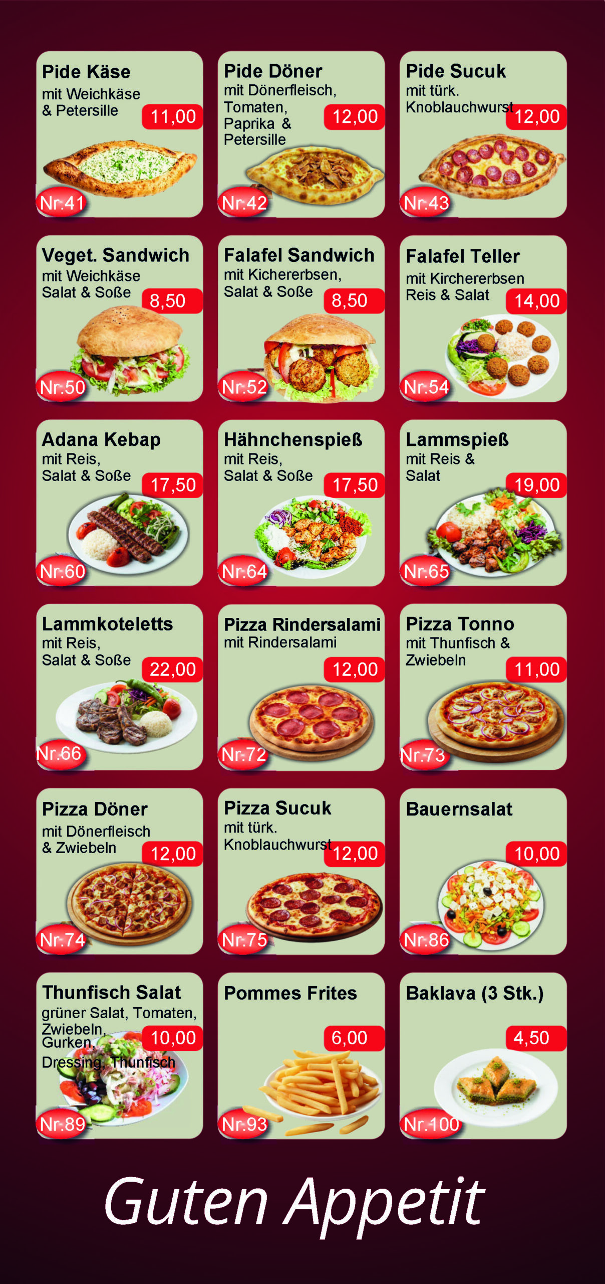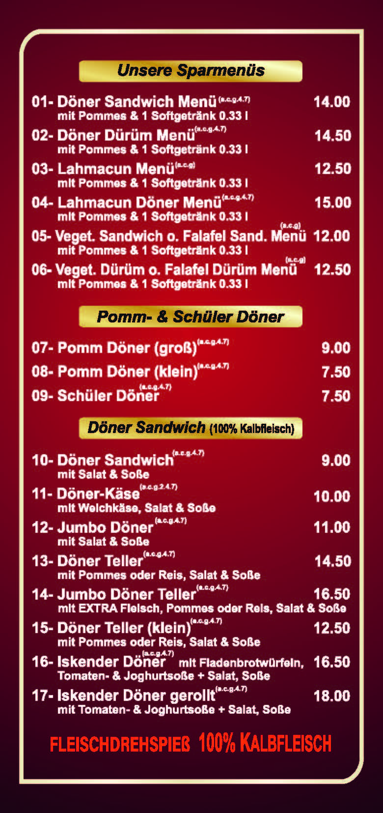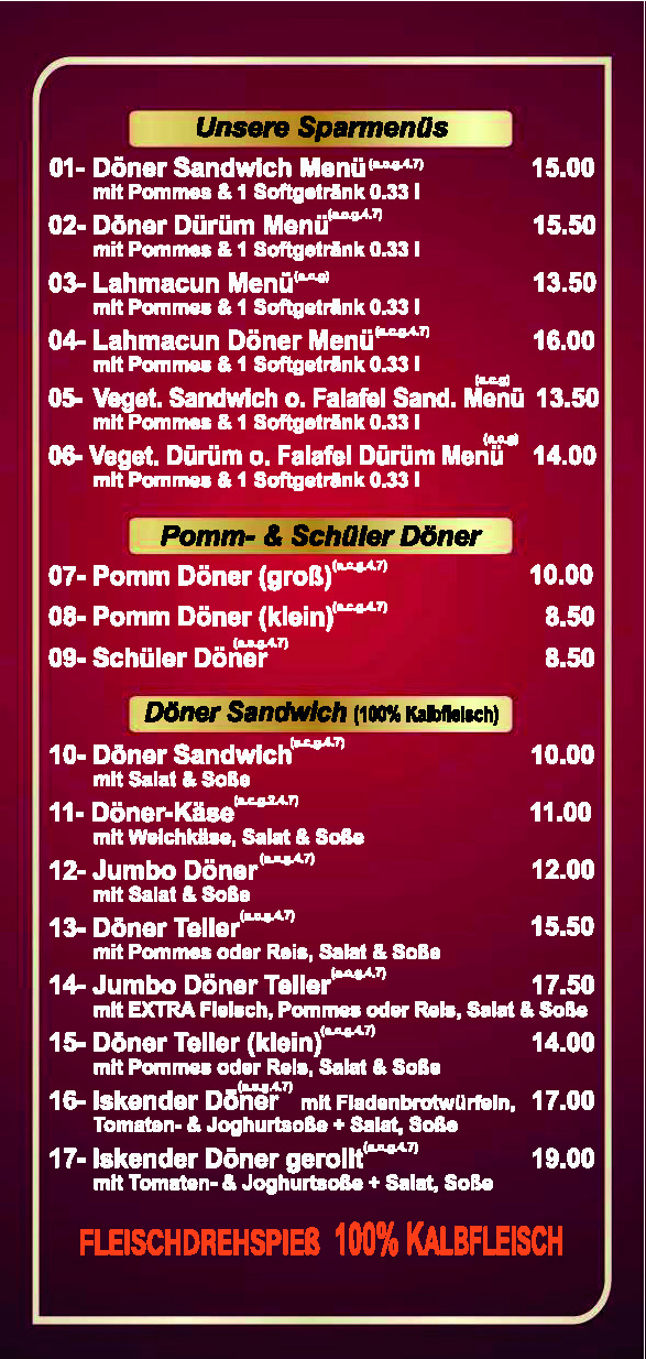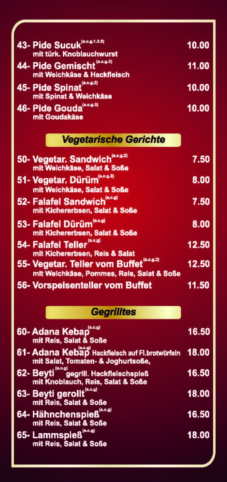 a) Glutanhaltig; b) Krebstiere; c) Eier & Eierzeugnisse; d) Fisch & Fischerzeugnisse; e) Erdnüsse & Erdnusserzeugnisse; f) Soja & Sojaerzeugnisse; g) Milch & Milcherzeugnisse/Lactose; h) Schalenobst(Nüsse); i) Sellerie & Sellerieerzeugnisse; j) Senf & Senferzeugnisse; k) Sesamsamen; l) Schwefeldioxid & Sulfide; m) Lupinen; n) Weichtiere (Schnecken, Muscheln, Kalmare, Austern)
