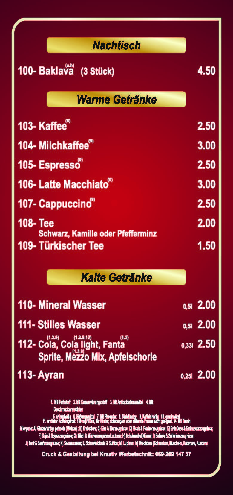 1. mit Farbstoff 2. mit Konservierungsstoff 3. mit Antioxidationsmittel 4. mit Geschmacksverstärker 5. Natriumnitrit 7. mit Phosphat 9. Koffeinhaltig 10. geschwärzt 12. enthält eine Phenylalaninquelle 14. Taurin Allergene